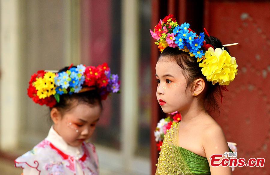 Girls wearing flowery headwear are seen at Xunpu Village of Quanzhou, east China's Fujian Province, Feb. 21, 2024. (Photo: China News Service/Zhang Bin)