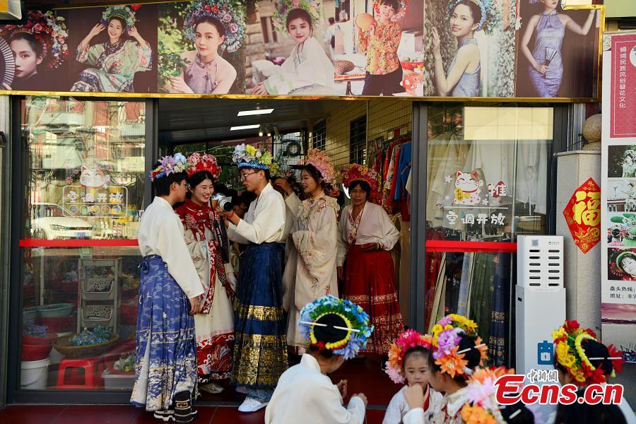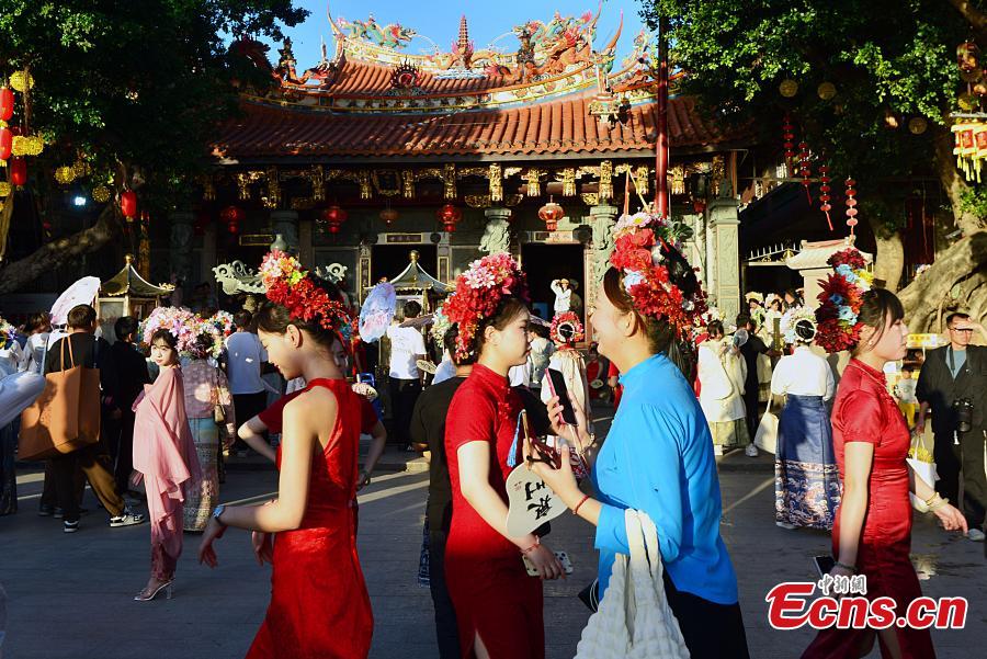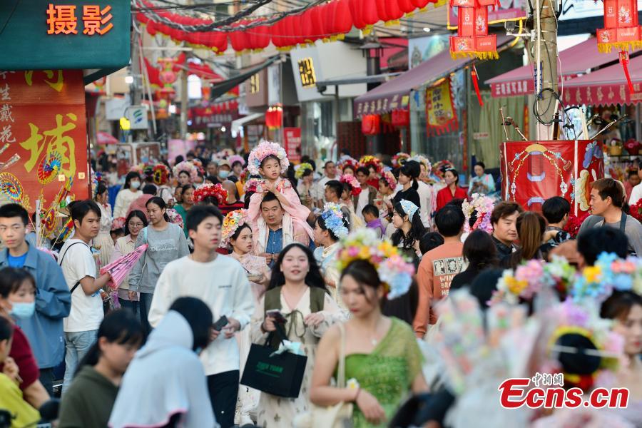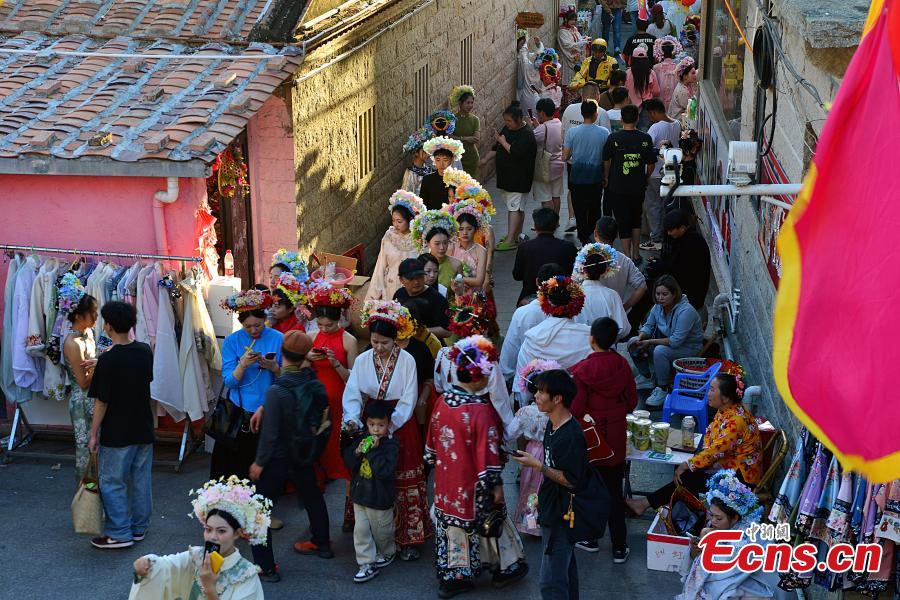 Visitors wearing flowery headwear are seen at Xunpu Village of Quanzhou, east China's Fujian Province, Feb. 21, 2024. (Photo: China News Service/Zhang Bin)