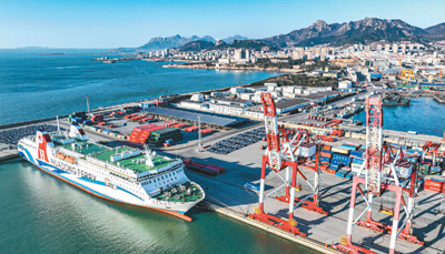 A cargo ship waits to load and unload goods at Shidao Xingang port in Rongcheng city, east China's Shandong Province. The port serves as a transit port for cross-border e-commerce. (Photo/Li Xinjun)