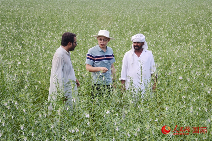 Xi Jianlong (center) talks with local farmers in a sesame field in Pakistan. (Photo/People’s Daily Online)
