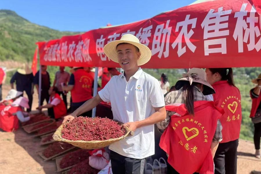 Wang Xiehong helps local people sell peppercorn through livestreams in Luanshishan Village, Longnan City of northwest China's Gansu Province, July 22, 2023. (Xinhua)