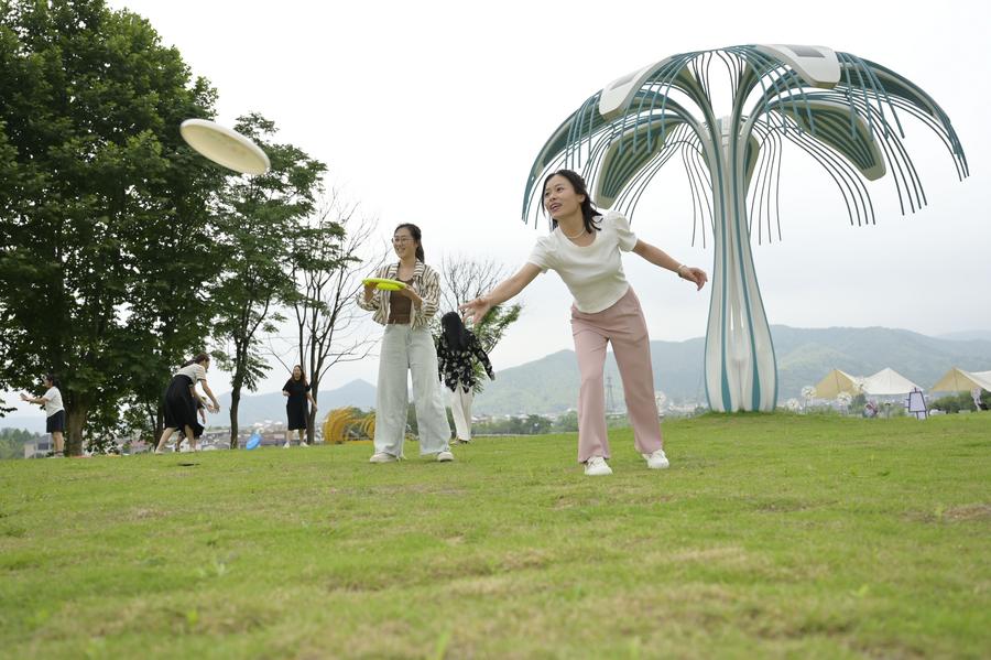 People play frisbee in front of a village library in Yucun Village of Anji County, east China's Zhejiang Province, June 5, 2023. (Xinhua/Cai Yang)