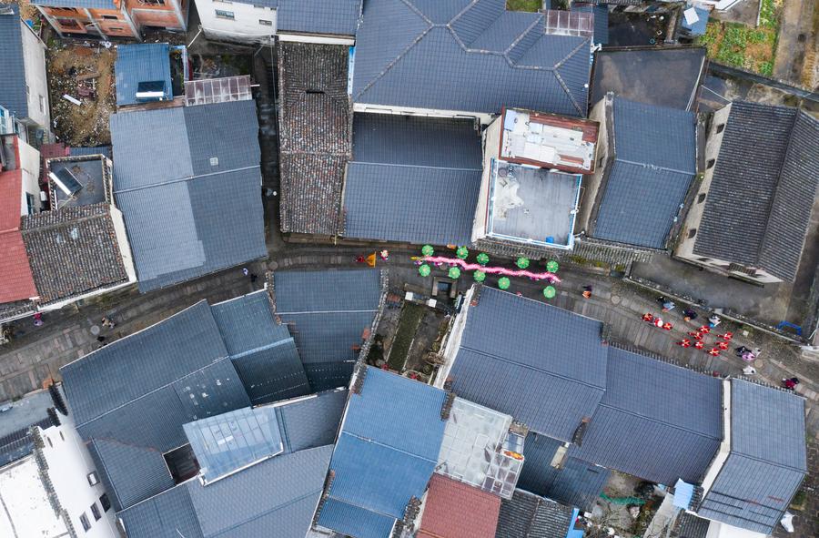 An aerial drone photo taken on Feb. 23, 2024 shows folk artists taking part in performances in celebration of the upcoming Lantern Festival in Heqiao Town, Lin'an District of Hangzhou, east China's Zhejiang Province. (Xinhua/Xu Yu)