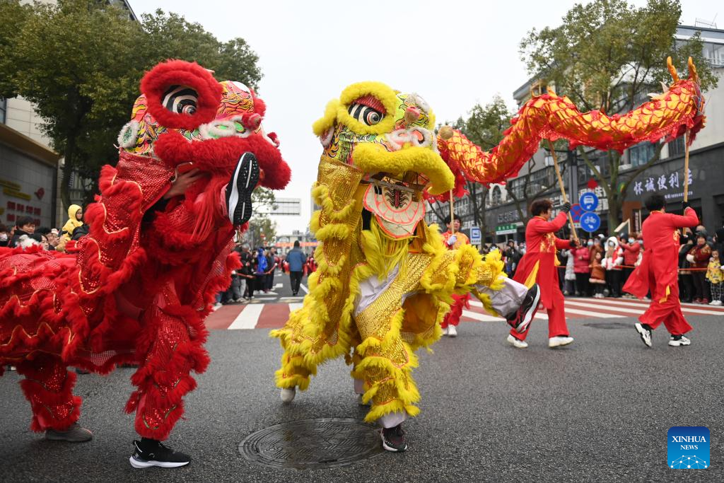 People perform lion and dragon dance during an event celebrating the upcoming Chinese Lantern Festival in Hefu Town of Huzhou City, east China's Zhejiang Province, Feb. 23, 2024. (Xinhua/Huang Zongzhi)