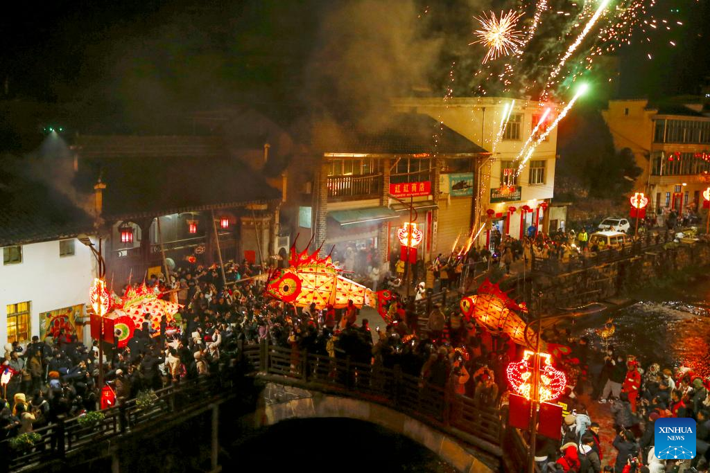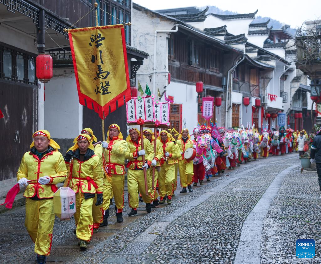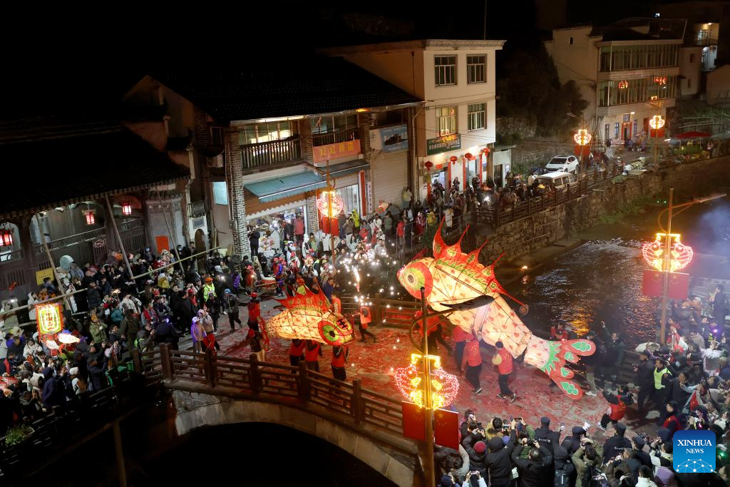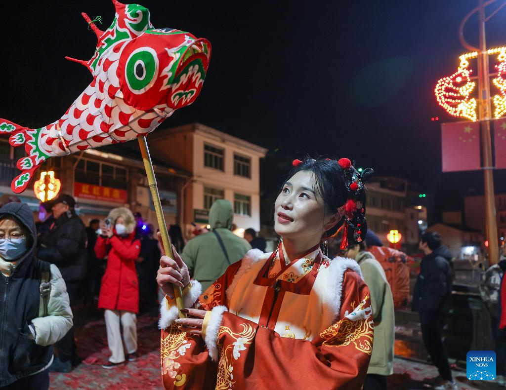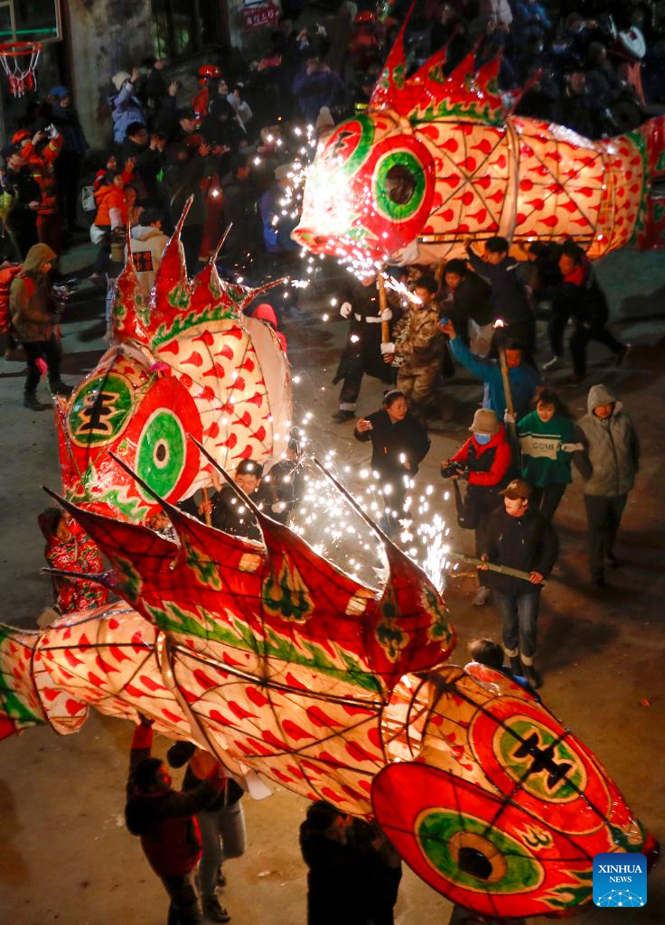 The fish-shaped lantern performing team patrol in Wangmantian Village, Shexian County of Huangshan City, east China's Anhui Province, Feb. 22, 2024. Local villagers have the tradition to make fish-shaped lanterns to pray for harvest and good fortune on the Lantern Festival, which falls on the 15th day of the first lunar month, or Feb. 24 this year. (Photo by Fan Chengzhu/Xinhua)