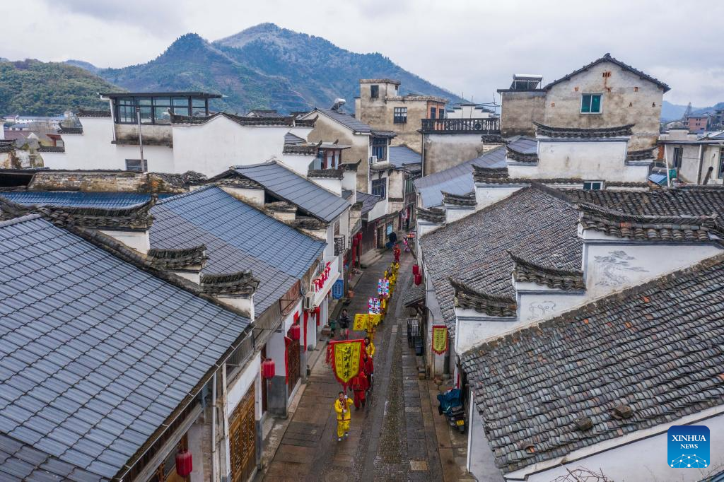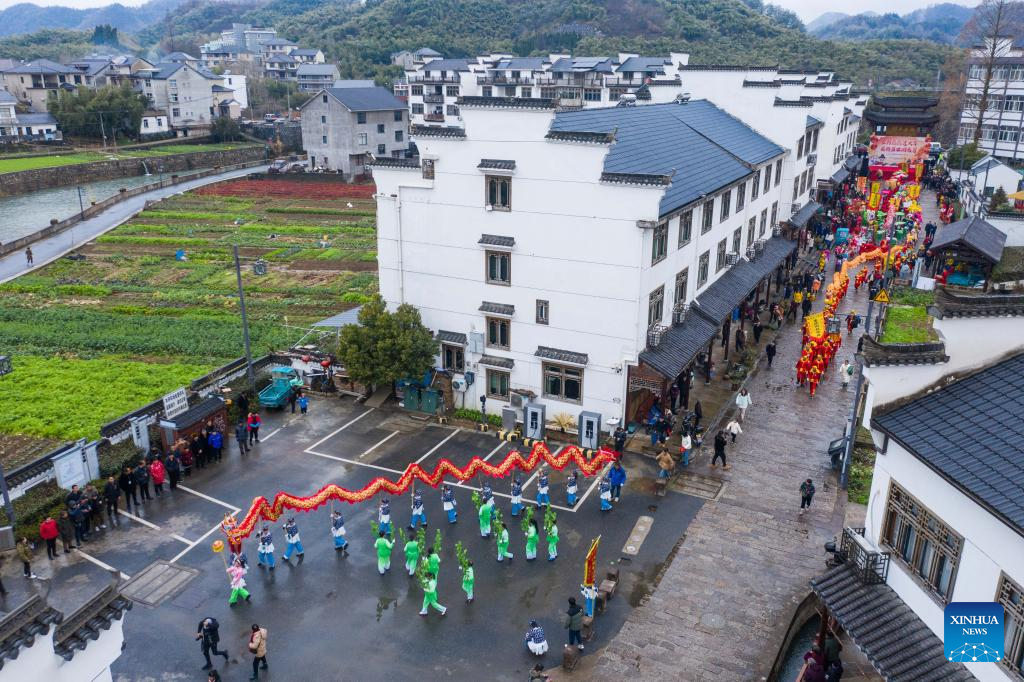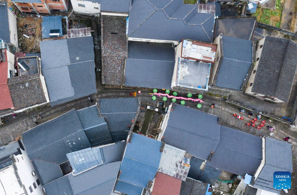 An aerial drone photo taken on Feb. 23, 2024 shows folk artists taking part in performances in celebration of the upcoming Lantern Festival in Heqiao Town, Lin'an District of Hangzhou, east China's Zhejiang Province. Several teams of folk art participated in the Lantern Festival celebrations in Heqiao Town on Friday. Heqiao is a famous town with a history of more than 1,000 years in western Zhejiang Province. The Lantern Festival falls on the 15th day of the first lunar month, or Feb. 24 this year. (Xinhua/Xu Yu)