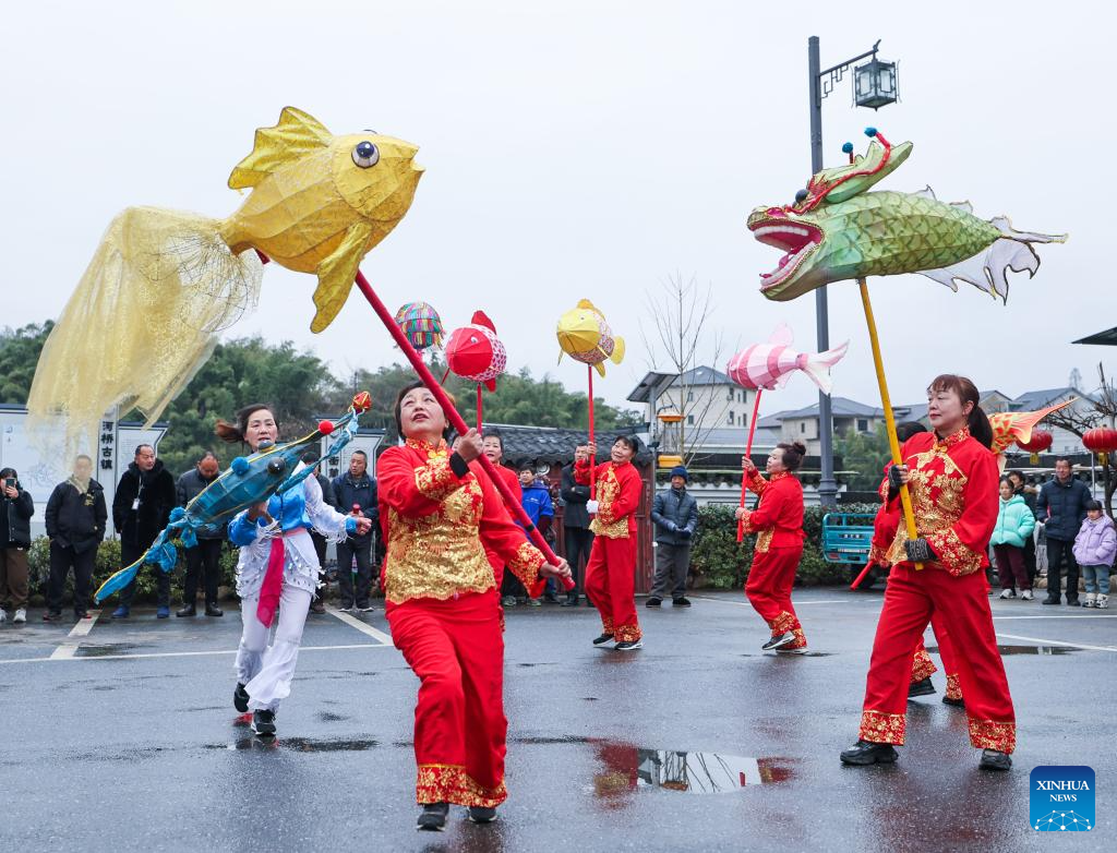 People perform dance during an event celebrating the upcoming Chinese Lantern Festival in Hefu Town of Huzhou City, east China's Zhejiang Province, Feb. 23, 2024. (Xinhua/Huang Zongzhi)