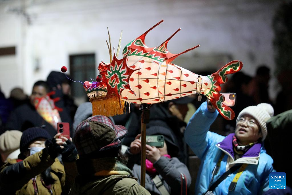 People take photos of a fish-shaped lantern in Wangmantian Village, Shexian County of Huangshan City, east China's Anhui Province, Feb. 22, 2024. Local villagers have the tradition to make fish-shaped lanterns to pray for harvest and good fortune on the Lantern Festival, which falls on the 15th day of the first lunar month, or Feb. 24 this year. (Photo by Fan Chengzhu/Xinhua)