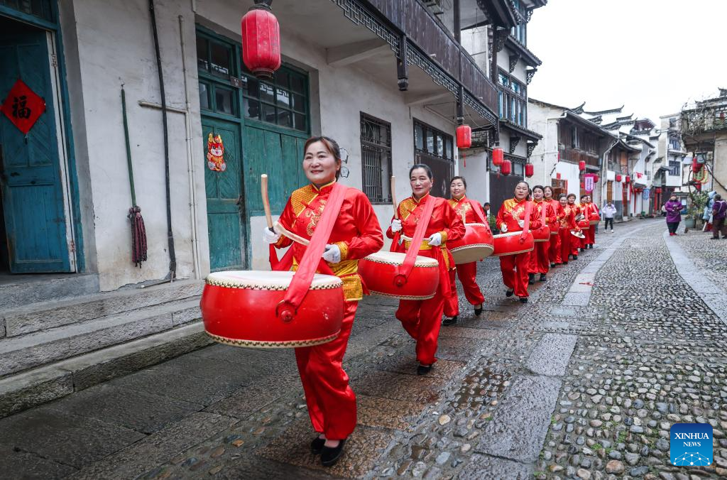 Folk artists perform drums in celebration of the upcoming Lantern Festival in Heqiao Town, Lin'an District of Hangzhou, east China's Zhejiang Province, Feb. 23, 2024. Several teams of folk art participated in the Lantern Festival celebrations in Heqiao Town on Friday. Heqiao is a famous town with a history of more than 1,000 years in western Zhejiang Province. The Lantern Festival falls on the 15th day of the first lunar month, or Feb. 24 this year. (Xinhua/Xu Yu)