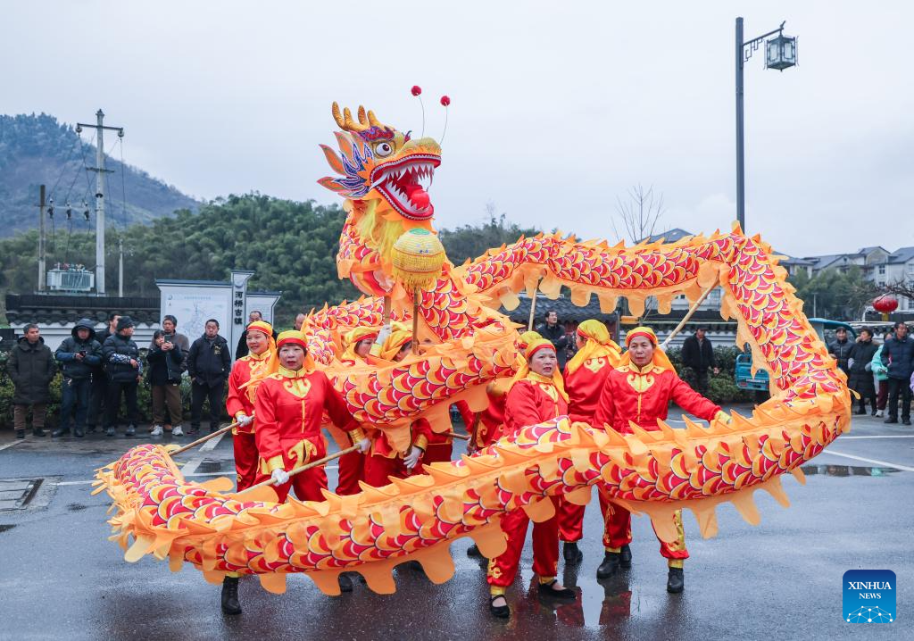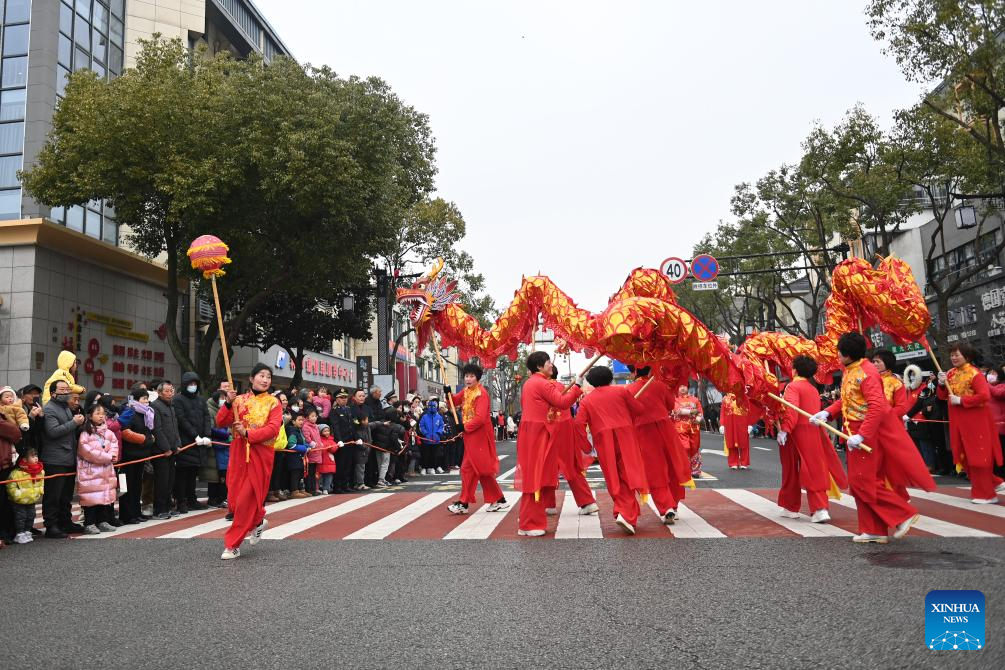 Folk artists perform dragon dance in celebration of the upcoming Lantern Festival in Heqiao Town, Lin'an District of Hangzhou, east China's Zhejiang Province, Feb. 23, 2024. Several teams of folk art participated in the Lantern Festival celebrations in Heqiao Town on Friday. Heqiao is a famous town with a history of more than 1,000 years in western Zhejiang Province. The Lantern Festival falls on the 15th day of the first lunar month, or Feb. 24 this year. (Xinhua/Xu Yu)