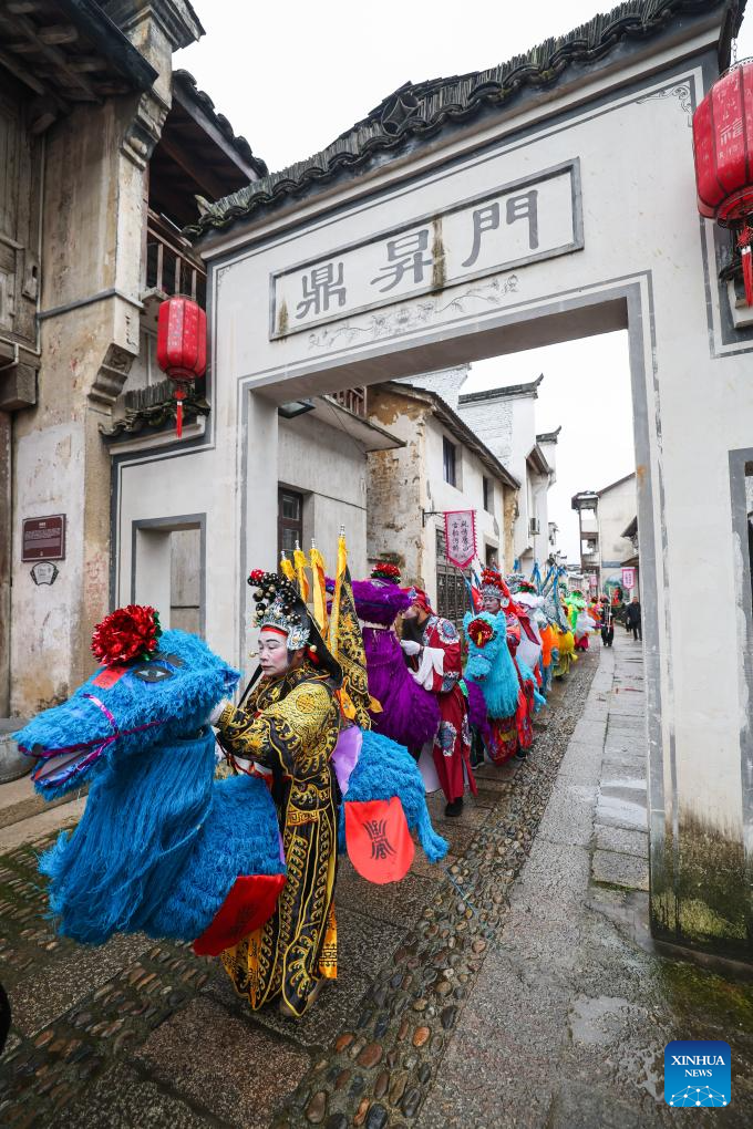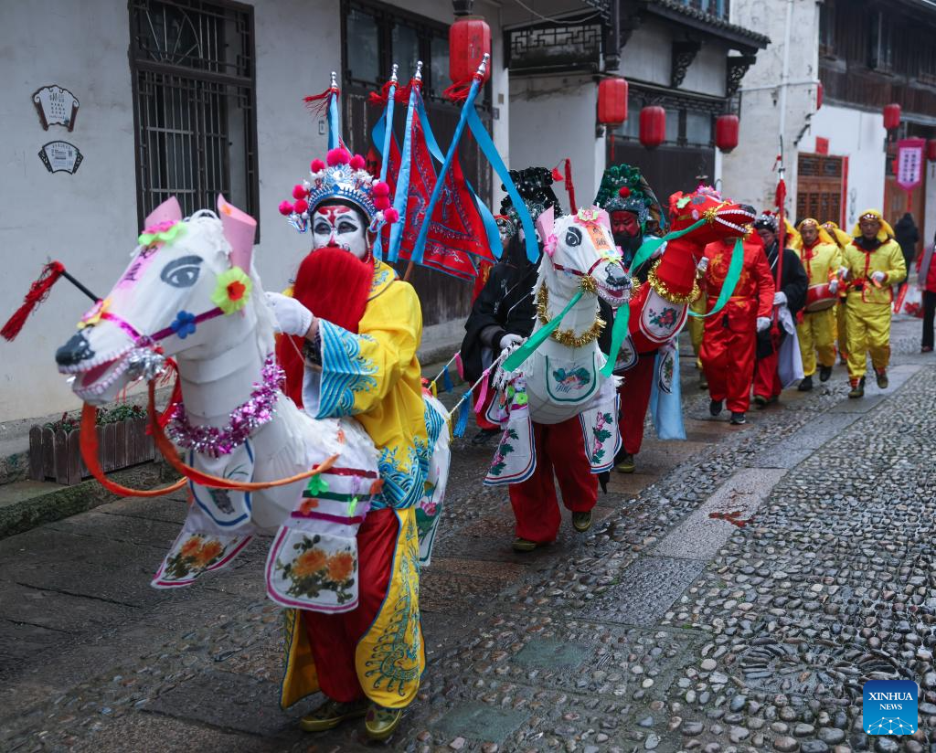 Folk artists perform in celebration of the upcoming Lantern Festival in Heqiao Town, Lin'an District of Hangzhou, east China's Zhejiang Province, Feb. 23, 2024. Several teams of folk art participated in the Lantern Festival celebrations in Heqiao Town on Friday. Heqiao is a famous town with a history of more than 1,000 years in western Zhejiang Province. The Lantern Festival falls on the 15th day of the first lunar month, or Feb. 24 this year. (Xinhua/Xu Yu)