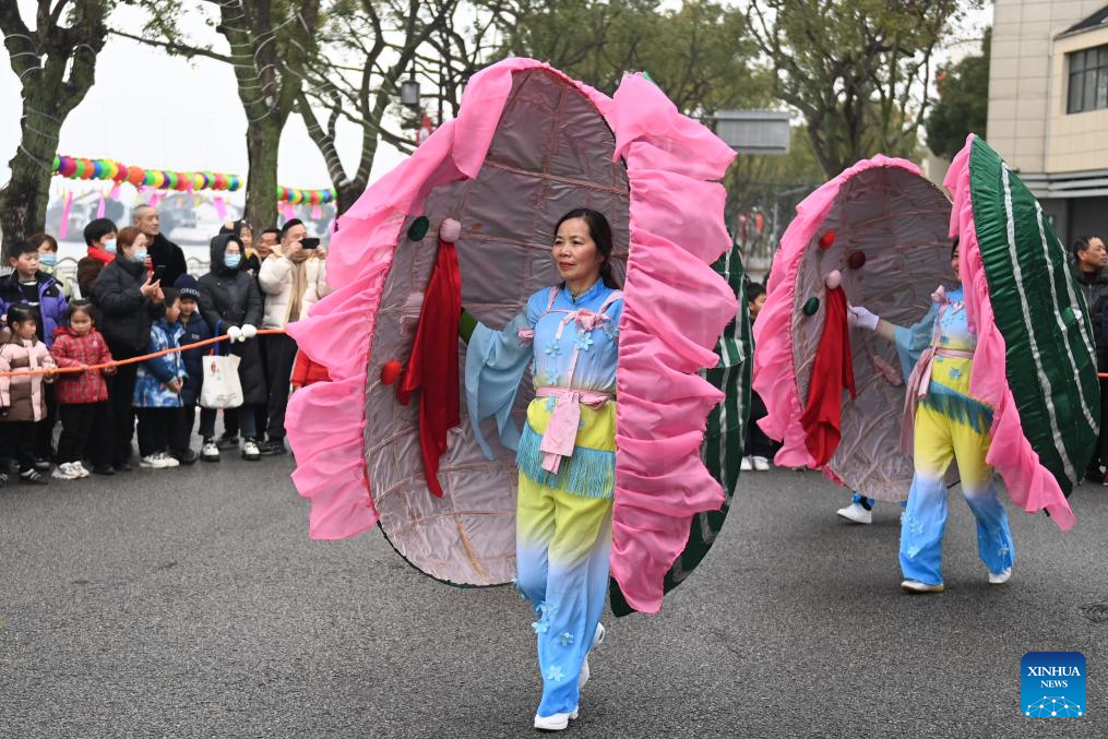 People perform during an event celebrating the upcoming Chinese Lantern Festival in Hefu Town of Huzhou City, east China's Zhejiang Province, Feb. 23, 2024. (Xinhua/Huang Zongzhi)
