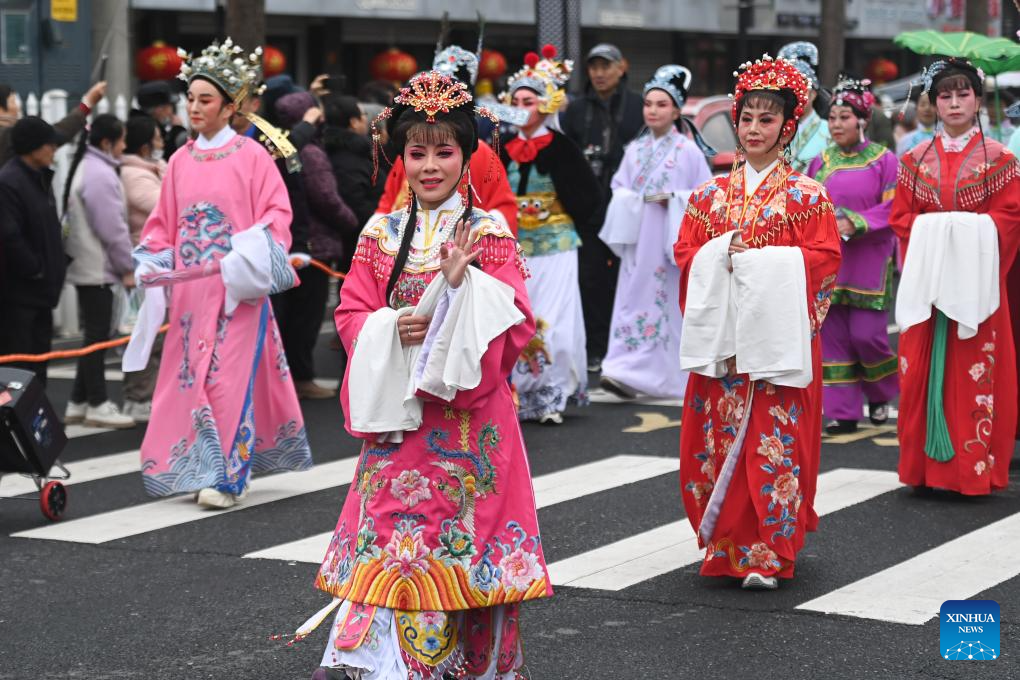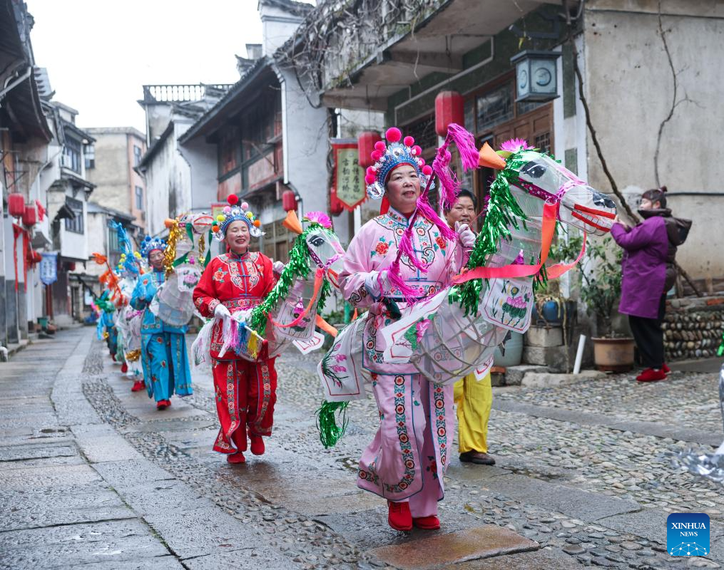 Folk artists take part in performances in celebration of the upcoming Lantern Festival in Heqiao Town, Lin'an District of Hangzhou, east China's Zhejiang Province, Feb. 23, 2024. Several teams of folk art participated in the Lantern Festival celebrations in Heqiao Town on Friday. Heqiao is a famous town with a history of more than 1,000 years in western Zhejiang Province. The Lantern Festival falls on the 15th day of the first lunar month, or Feb. 24 this year. (Xinhua/Xu Yu)