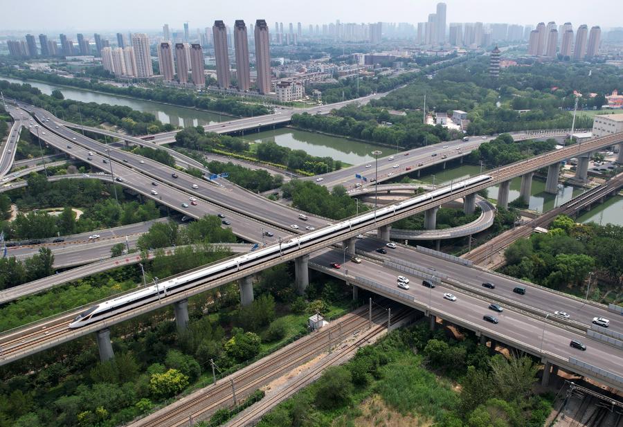 An aerial drone photo taken on July 20, 2023 shows a train running along the Beijing-Tianjin Intercity Railway in the urban area of north China's Tianjin. (Xinhua/Zhang Chenlin)