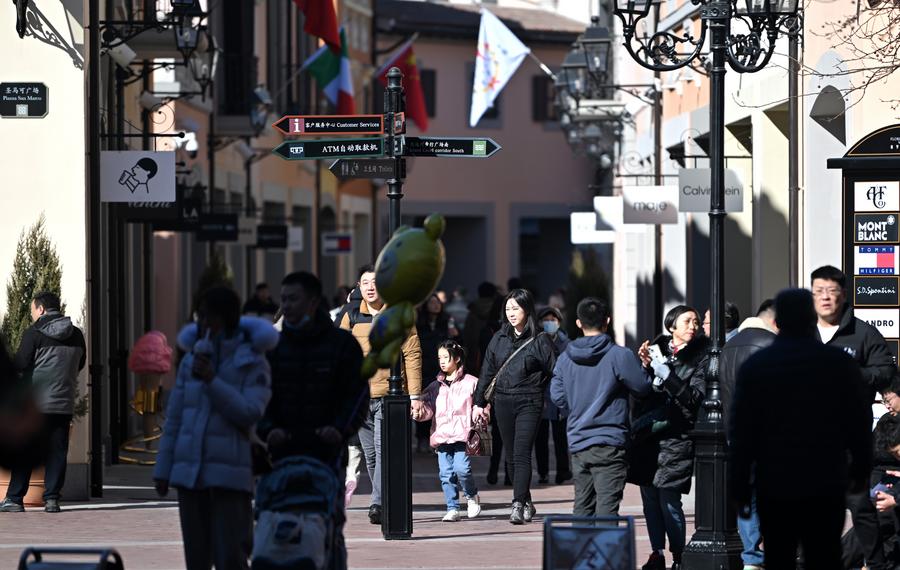 People visit an Italian business district next to the high-speed railway station in Wuqing, a suburban district of Tianjin, Feb. 15, 2024. (Xinhua/Li Ran)