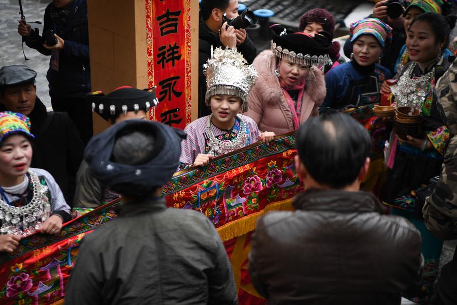 This file photo taken on Feb. 16, 2019 shows a matchmaking event in Shibadong Village of Xiangxi Tujia and Miao Autonomous Prefecture, central China's Hunan Province. (Xinhua/Xue Yuge)