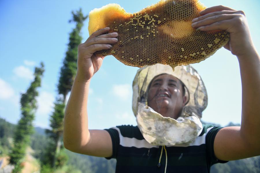This file photo taken on Sept. 4, 2019 shows Long Xianlan holding a honeycomb in Shibadong Village of Xiangxi Tujia and Miao Autonomous Prefecture, central China's Hunan Province. (Xinhua/Chen Zeguo)