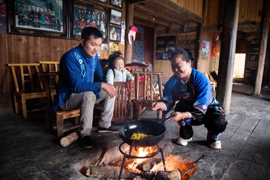 This file photo taken on April 16, 2021 shows the family of Long Xianlan preparing breakfast in Shibadong Village of Xiangxi Tujia and Miao Autonomous Prefecture, central China's Hunan Province. (Xinhua/Chen Sihan)