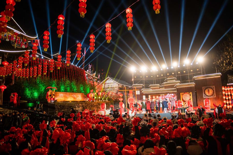 This file photo taken on Jan. 18, 2020 shows a view of the branch venue of Hunan TV Spring Festival Gala 2020 in Shibadong Village of Xiangxi Tujia and Miao Autonomous Prefecture, central China's Hunan Province. (Xinhua/Chen Sihan)