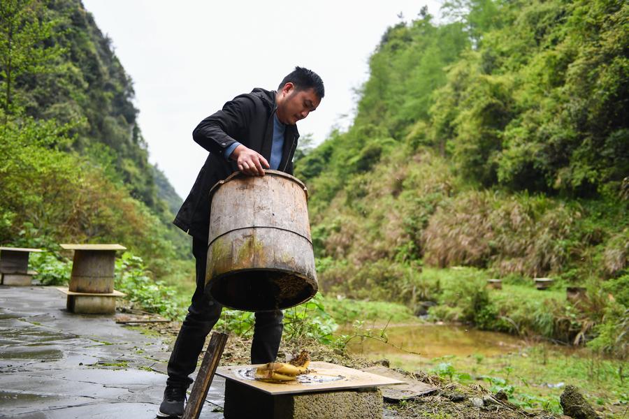 This file photo taken on April 16, 2021 shows Long Xianlan checking a honeybee hive in Shibadong Village of Xiangxi Tujia and Miao Autonomous Prefecture, central China's Hunan Province. (Xinhua/Chen Sihan)