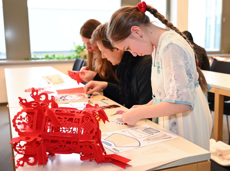 People make handicrafts during a celebration of the Lantern Festival at the Chinese Cultural Center in Berlin, Germany, Feb. 24, 2024. (Xinhua/Ren Pengfei)