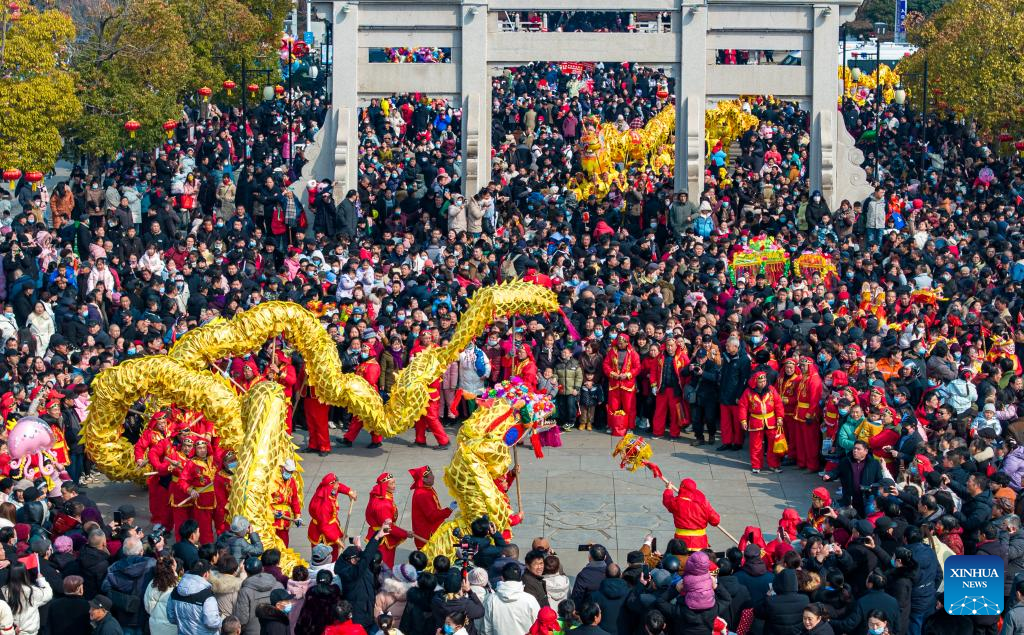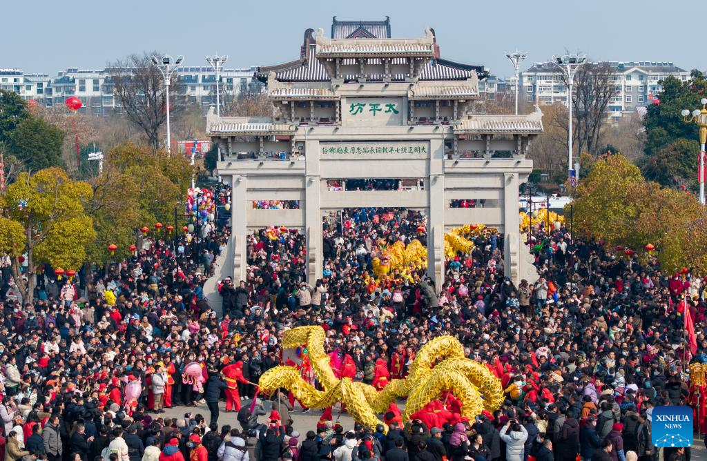 An aerial drone photo taken on Feb. 25, 2024 shows people watching dragon dance on a square in Quanjiao County, Chuzhou City of east China's Anhui Province. The annual folk activity in Quanjiao was held on the 16th day of the first month on Chinese lunar calendar. (Photo by Liu Yucai/Xinhua)