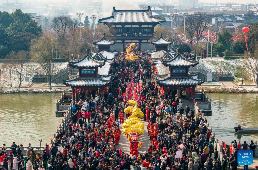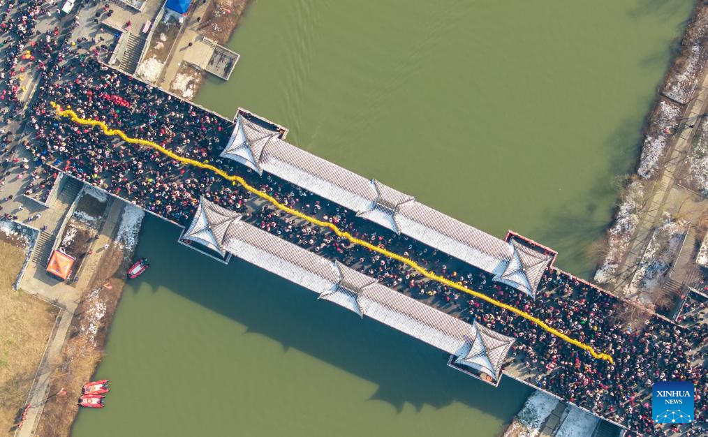 An aerial drone photo taken on Feb. 25, 2024 shows performers walking past the Taiping Bridge in Quanjiao County, Chuzhou City of east China's Anhui Province. The annual folk activity in Quanjiao was held on the 16th day of the first month on Chinese lunar calendar. (Photo by Liu Yucai/Xinhua)