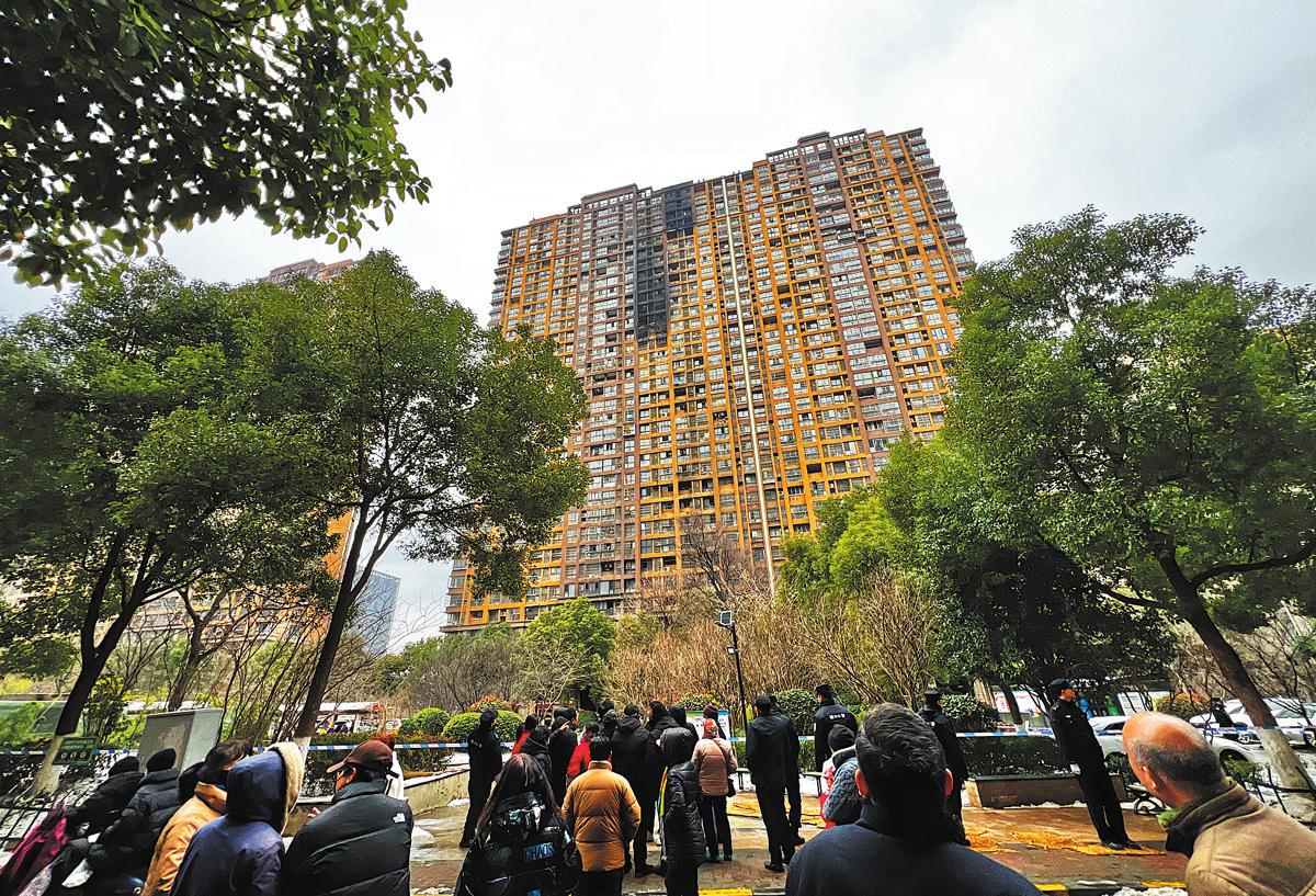 A crowd gathers outside a residential building in Nanjing, Jiangsu province, after it caught fire on Friday. The blaze killed 15 people and injured 44. [Photo by Yang Bo / China News Service]
