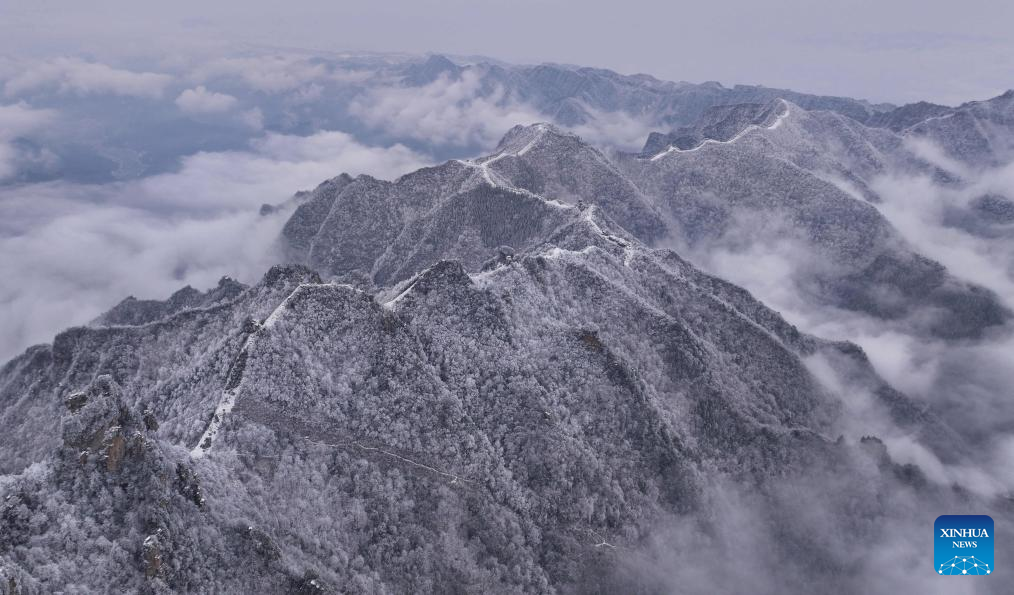 An aerial drone photo taken on Feb. 25, 2024 shows a view of the Tianzi Mountain after rain and snow at Zhangjiajie National Forest Park in central China's Hunan Province. (Photo by Wu Yongbing/Xinhua)