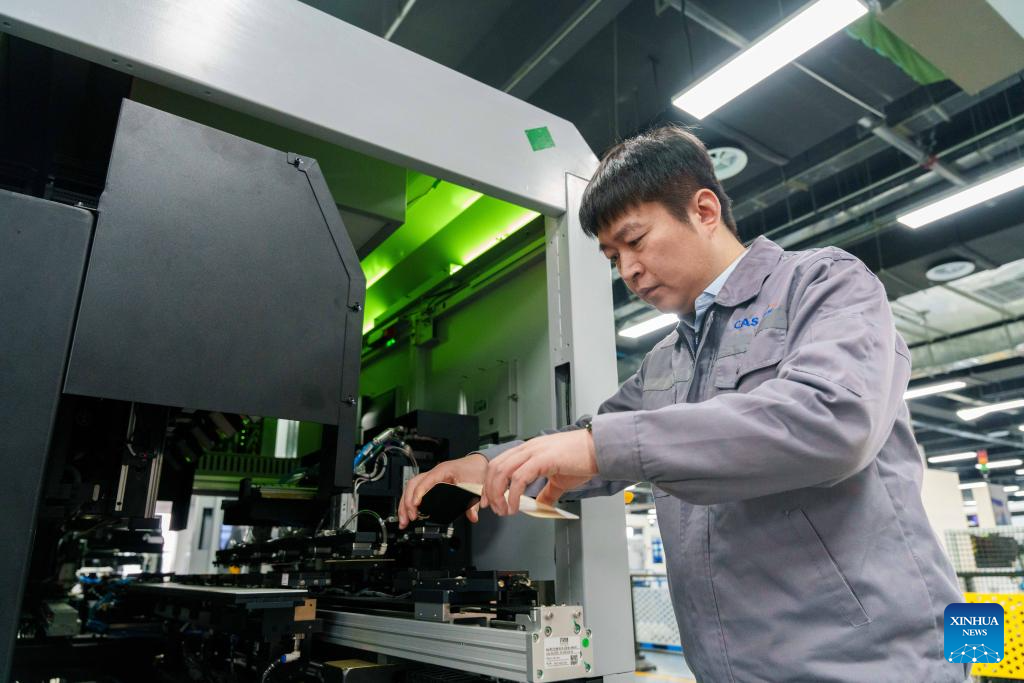 Zhang Zhengtao picks a glass back cover for mobile phone from an intelligent inspection device at the headquarters of CASI Vision in Luoyang, central China's Henan Province, Feb. 3, 2024. (Xinhua/Zhou Dixiao)