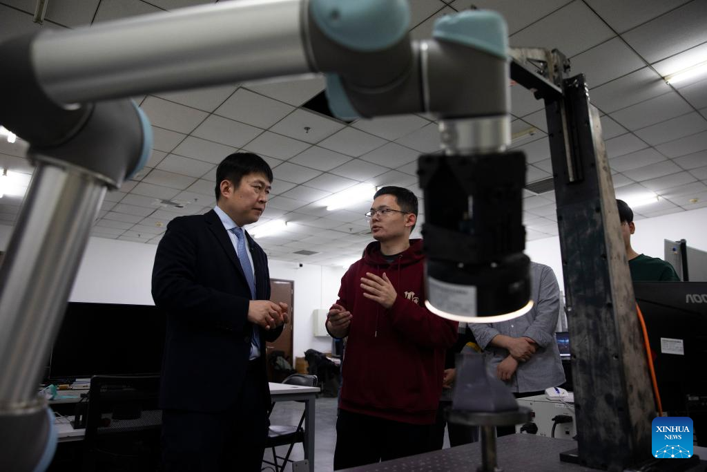 Zhang Zhengtao (L) discusses with his colleague on research, development and application of an intelligent inspection device at the headquarters of CASI Vision in Luoyang, central China's Henan Province, Feb. 3, 2024. (Xinhua/Zhou Dixiao)?
