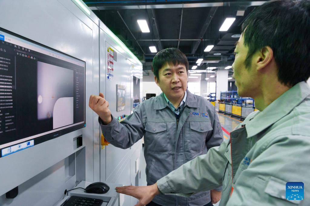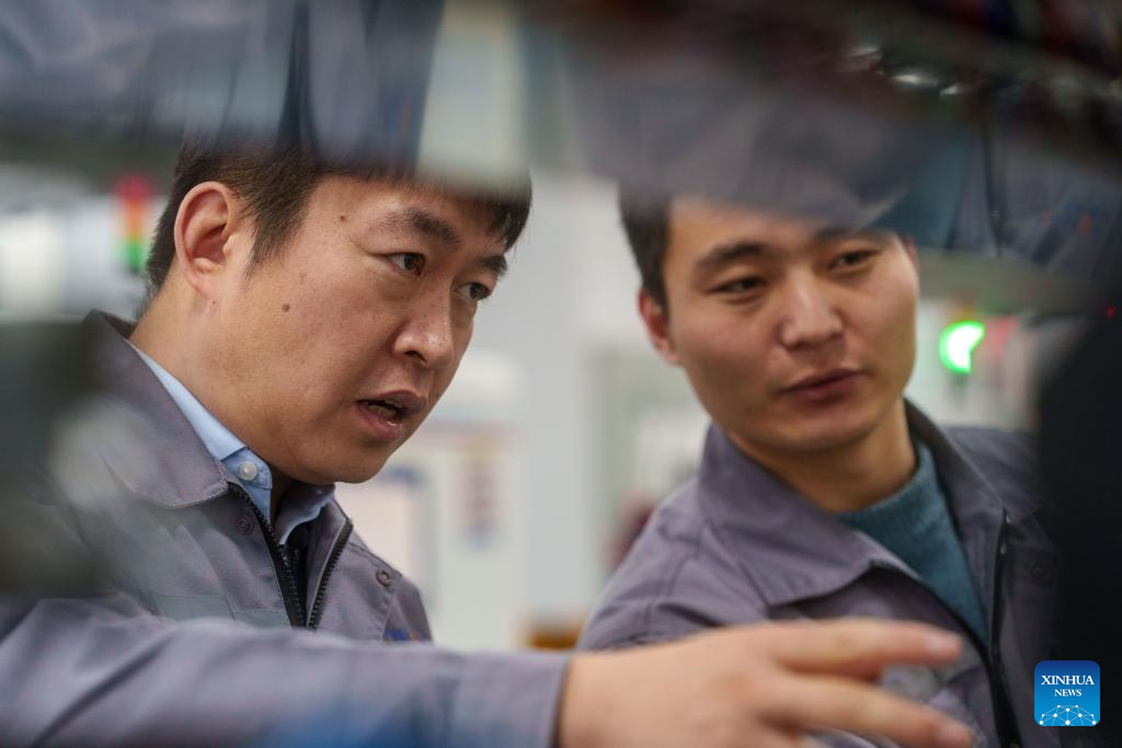 Zhang Zhengtao (L) discusses the panel operation of an intelligent inspection device with his colleague at the headquarters of CASI Vision in Luoyang, central China's Henan Province, Feb. 3, 2024. (Xinhua/Zhou Dixiao)
