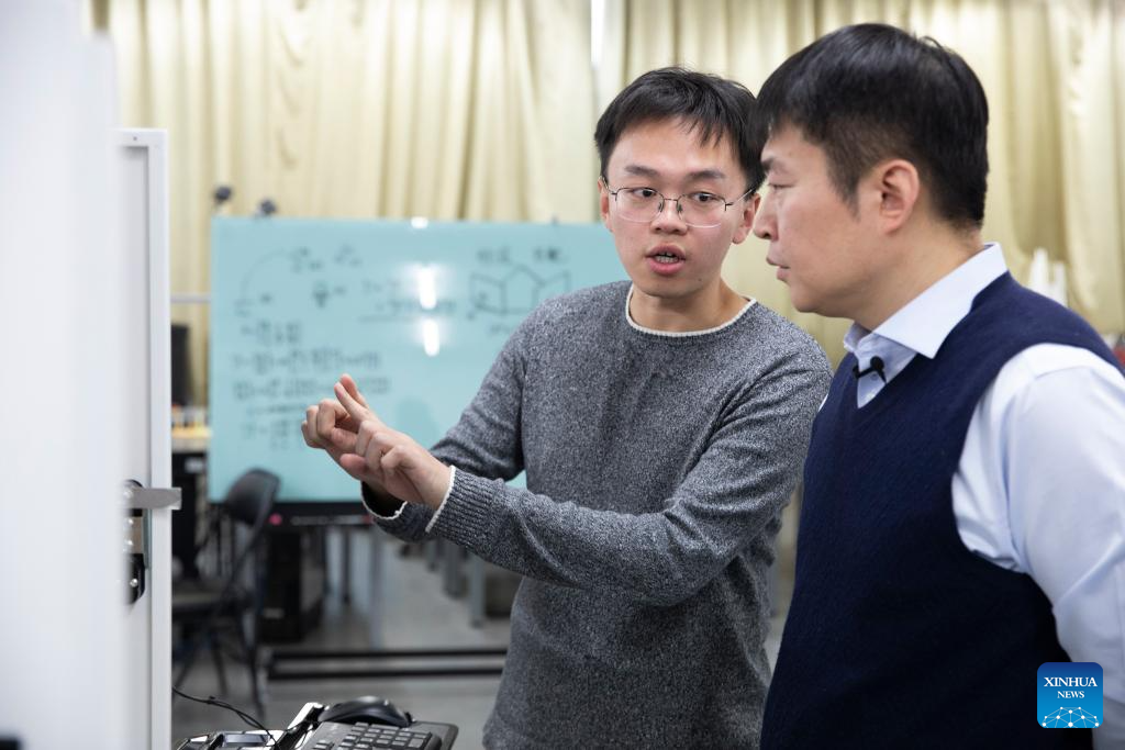 Zhang Zhengtao (R) discusses research progress with a student at a lab of the Institute of Automation of the Chinese Academy of Sciences (CASIA) in Beijing, capital of China, Jan. 25, 2024. (Xinhua/Jin Liwang)