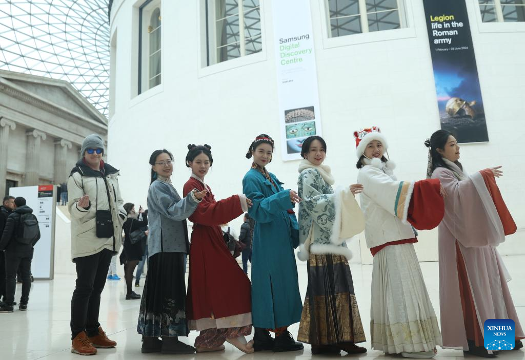 Hanfu enthusiasts display Hanfu at the British Museum in London, Britain, Feb. 25, 2024. Hanfu enthusiasts wearing Hanfu, a style of clothing traditionally worn by the Han people, introduced Chinese traditional culture to local people and visitors in London on Sunday. (Xinhua/Li Ying)