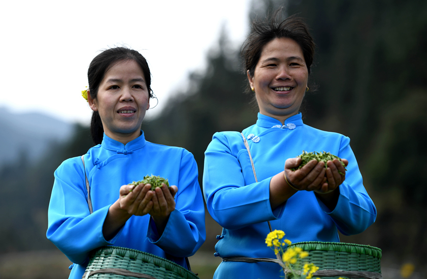 Farmers have been busy harvesting spring tea leaves recently in Meidong village, Piaoli township, Longsheng county, south China's Guangxi Zhuang Autonomous Region.