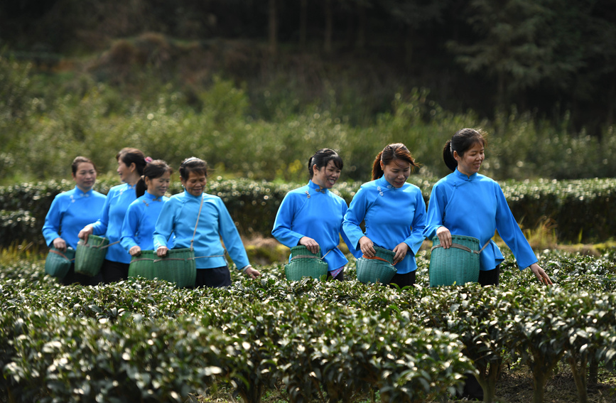 Farmers harvest early spring tea leaves in S China's Guangxi