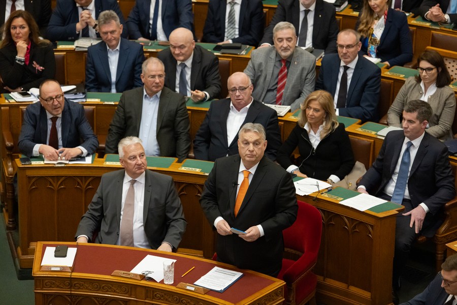 Hungarian Prime Minister Viktor Orban (R, Front) speaks during the spring session of the Hungarian parliament in Budapest, Hungary, on Feb. 26, 2024. (Photo by Attila Volgyi/Xinhua)