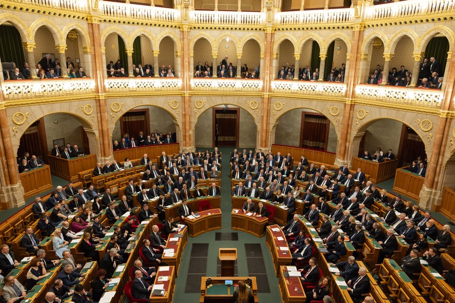 Members of the Hungarian parliament vote on a bill on Sweden's bid to join the North Atlantic Treaty Organization (NATO) in Budapest, Hungary, on Feb. 26, 2024. (Photo by Attila Volgyi/Xinhua)