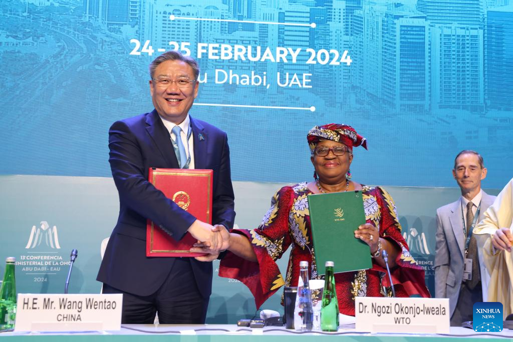 China's Commerce Minister Wang Wentao (L) poses for a photo with WTO Director-General Ngozi Okonjo-Iweala after signing a new Memorandum of Understanding on the China Program during the 12th China Round Table on WTO Accessions held in Abu Dhabi, the United Arab Emirates, Feb. 25, 2024. (WTO/Handout via Xinhua)