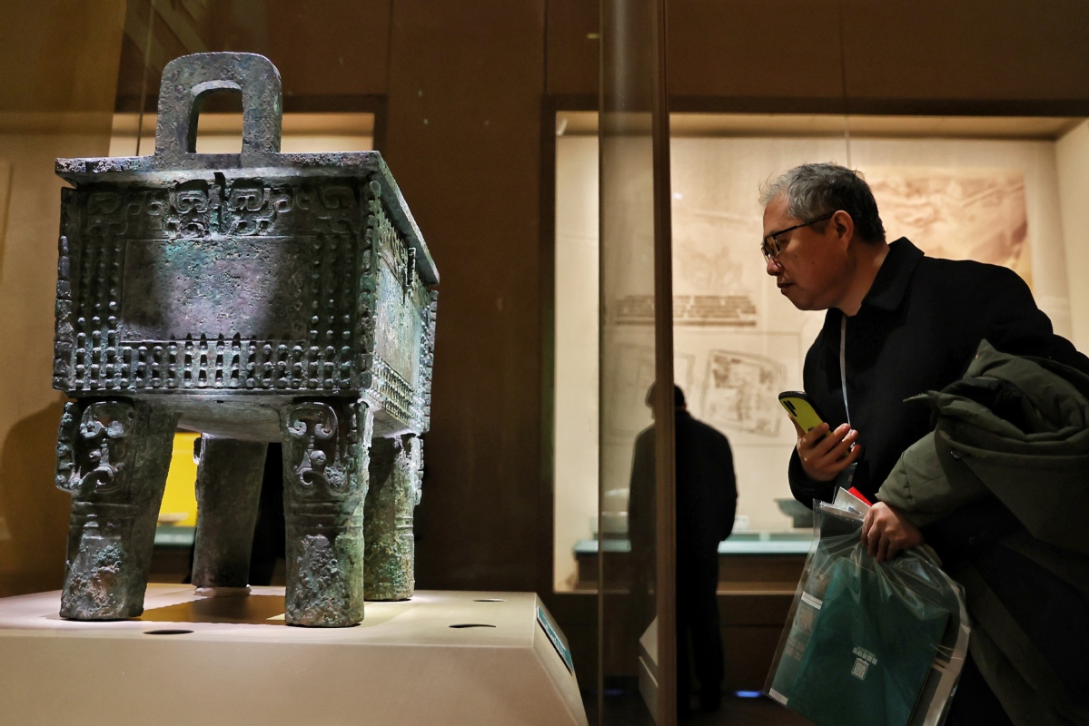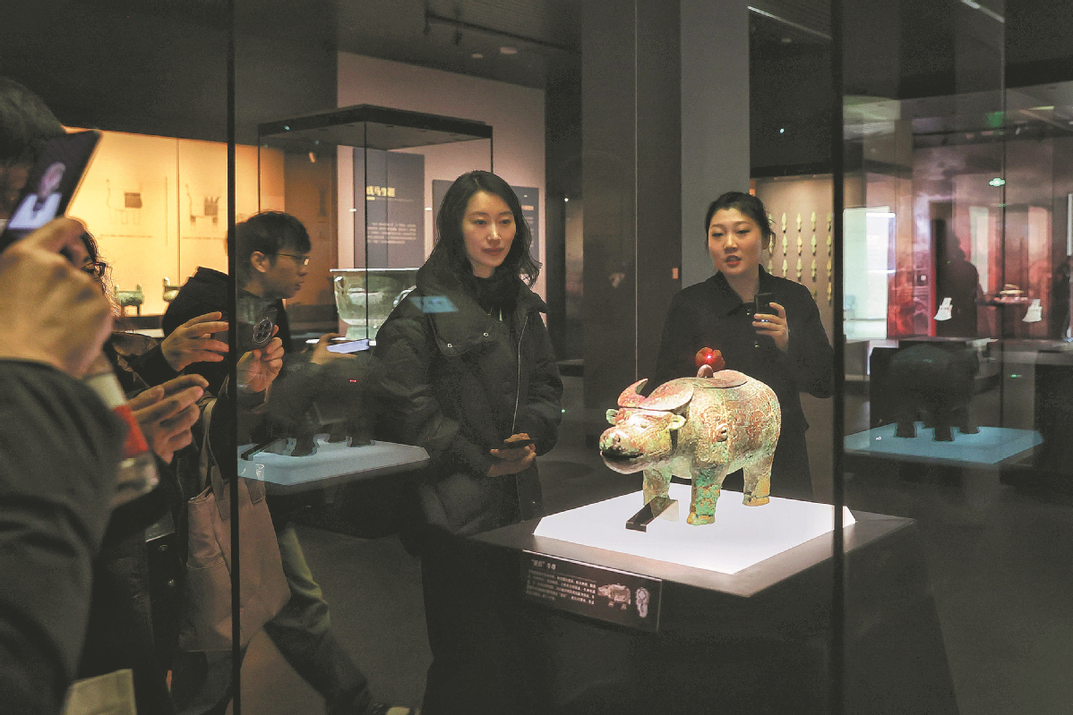 Visitors admire a bronze figurine on display at the new building of the Yinxu Museum, which opened to the public on Monday, in Anyang, Henan province. The new building boasts an exhibition area of 22,000 square meters, where nearly 4,000 cultural relics, including bronzeware, pottery and jade objects, are on display. The expanded museum is the first national archaeological museum to comprehensively present the civilization of the Shang Dynasty (1600 BC-1046 BC). The museum's old building was built in 2005. JIANG DONG/CHINA DAILY