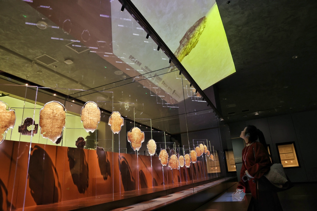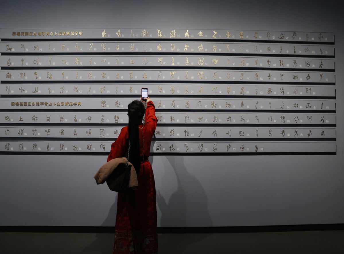 A visitor admires oracle bone inscriptions on display at the new building of the Yinxu Museum, which opened to the public on Monday, in Anyang, Henan province. JIANG DONG/CHINA DAILY