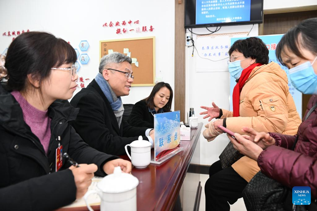 Zhang Junjie (4th L) communicates with residents at a local legislators' liaison station in Qinhuai District of Nanjing, east China's Jiangsu Province, Feb. 22, 2024. (Xinhua/Ji Chunpeng)