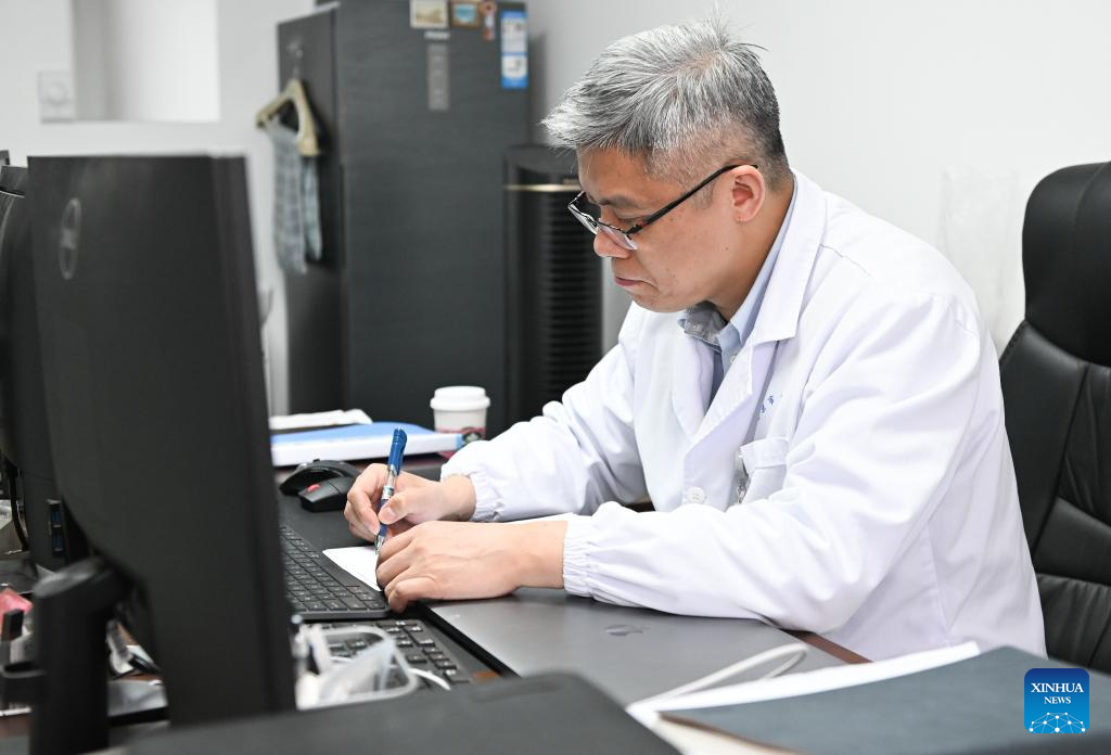 Zhang Junjie prepares his suggestions for the upcoming second session of the 14th National People's Congress at the Nanjing First Hospital in Nanjing, east China's Jiangsu Province, Feb. 20, 2024. (Xinhua/Ji Chunpeng)