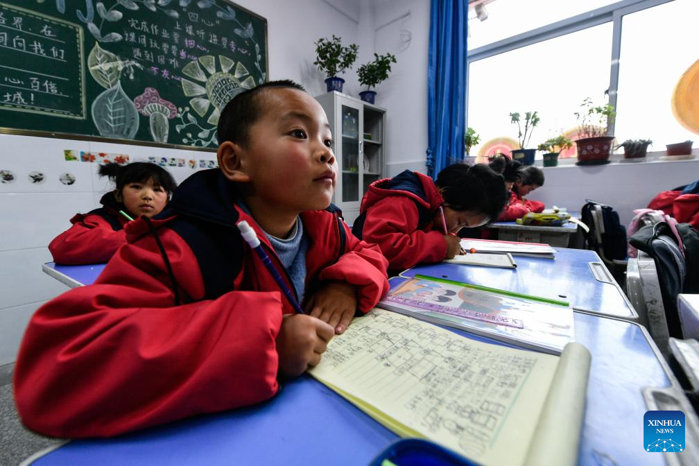 Students attend a class at Xiaohongping Primary School in Shiyuan Town of Jishishan County, northwest China's Gansu Province, Feb. 26, 2024. (Xinhua/Lang Bingbing)