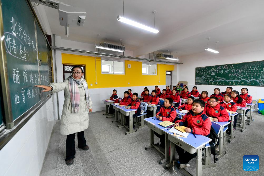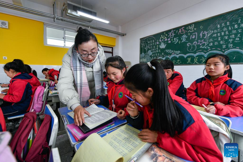 A teacher instructs students at Xiaohongping Primary School in Shiyuan Town of Jishishan County, northwest China's Gansu Province, Feb. 26, 2024. (Xinhua/Lang Bingbing)