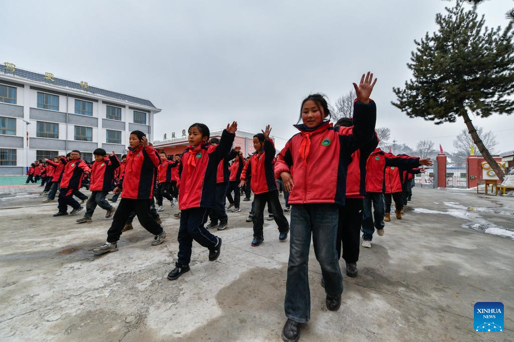 Students take exercise at Xiaohongping Primary School in Shiyuan Town of Jishishan County, northwest China's Gansu Province, Feb. 26, 2024. (Xinhua/Lang Bingbing)?