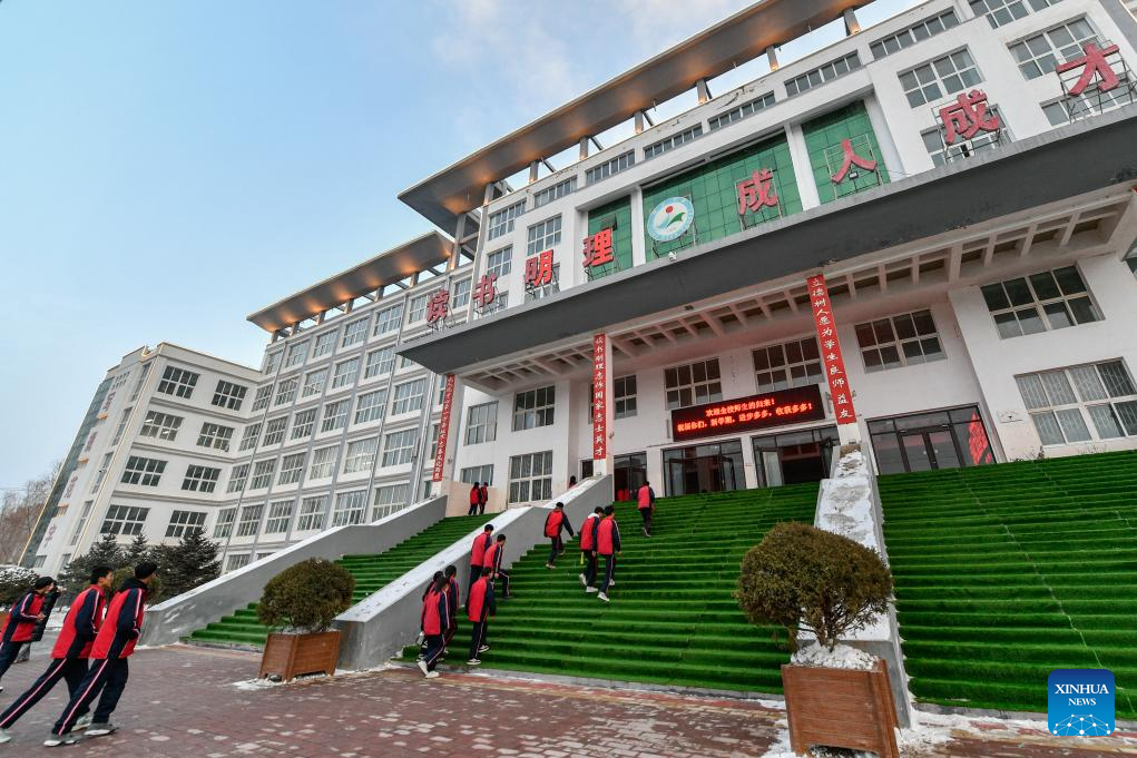 Students enter the teaching building of Jishi Middle School in Jishishan County, northwest China's Gansu Province, Feb. 26, 2024. (Xinhua/Lang Bingbing)