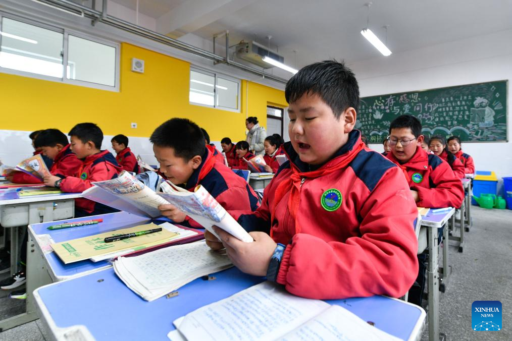 Students read at Xiaohongping Primary School in Shiyuan Town of Jishishan County, northwest China's Gansu Province, Feb. 26, 2024. (Xinhua/Lang Bingbing)