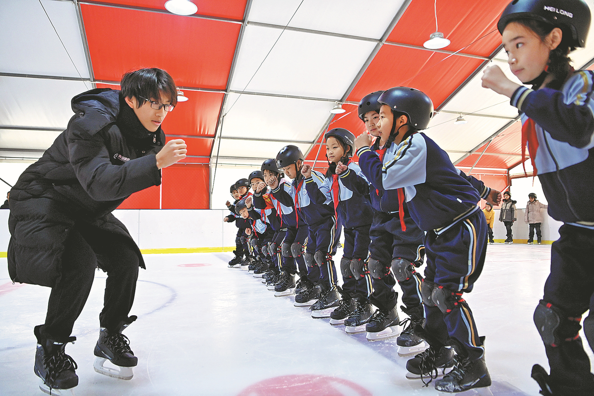 Students take skating lessons on an ice rink at a primary school in Tianjin on Jan 10. LI RAN/XINHUA