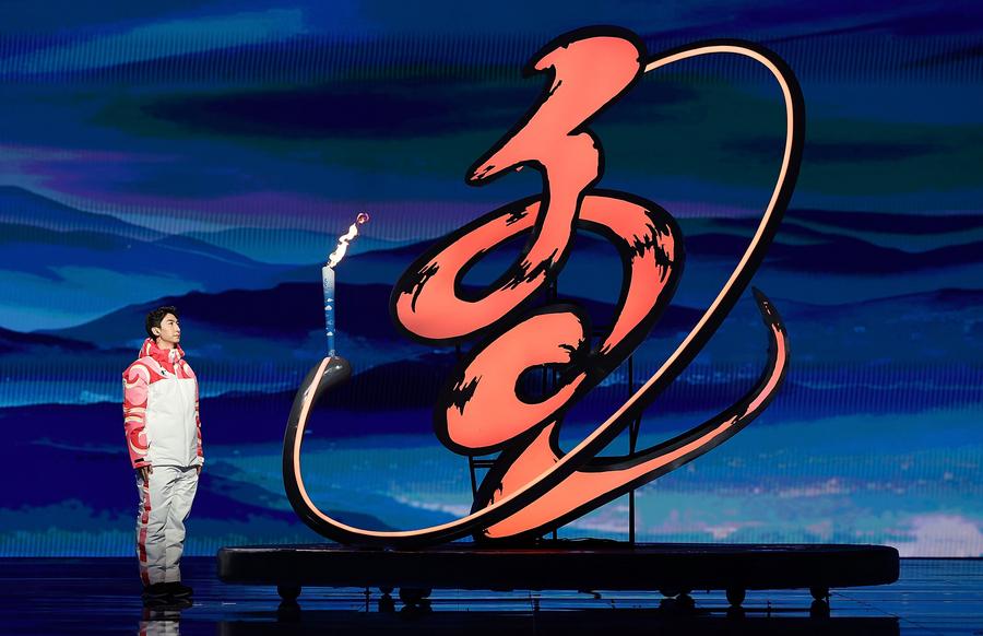 Torchbearer Wu Dajing sets the torch into the cauldron during the opening ceremony of China's 14th National Winter Games in Hulun Buir, north China's Inner Mongolia Autonomous Region, Feb. 17, 2024. (Xinhua/Li Bo)